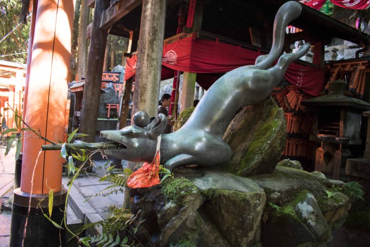 狐狸的青銅像旁邊又有一個供奉小鳥居的地方