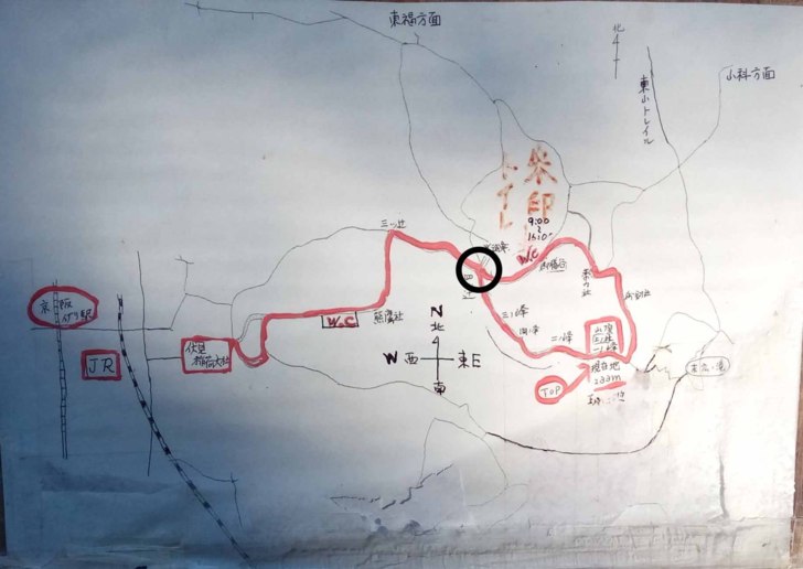 現在的地點是在圖中黑色圓圈的地方,從這邊到伏見稻荷大社是最多人的地方,從這邊往山頂走,人就比較少了