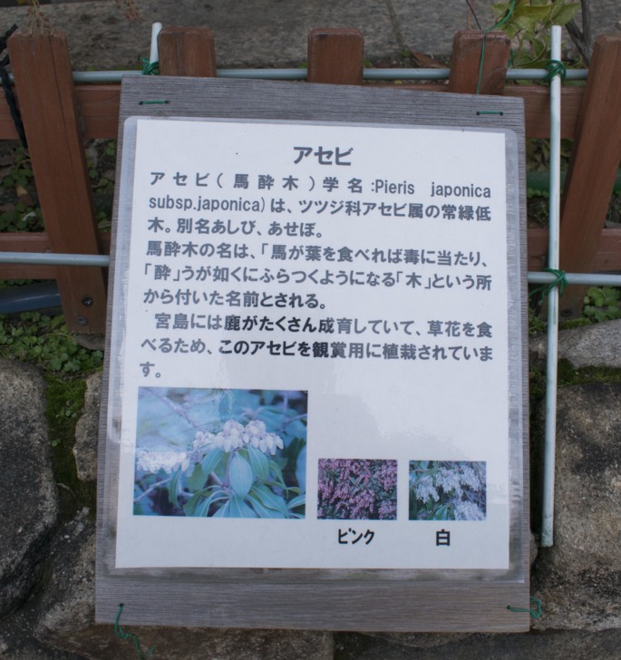 因為馬吃了會中毒,其症狀有如酒醉般,所以別名馬醉木。因為宮島的鹿很多,而且會吃路上的草跟花,所以種了觀賞用的馬醉木。