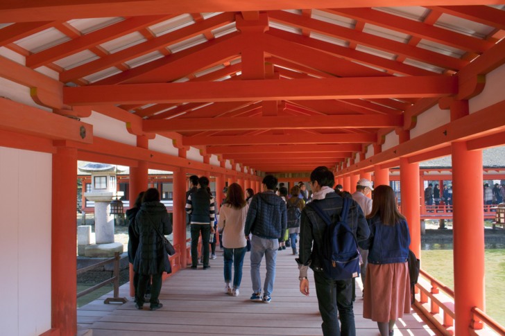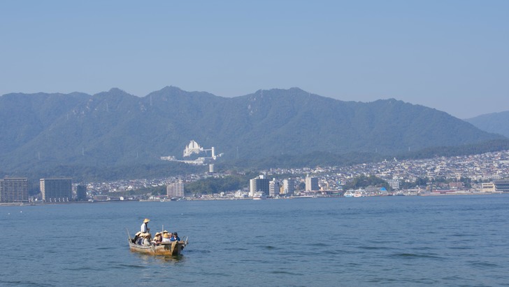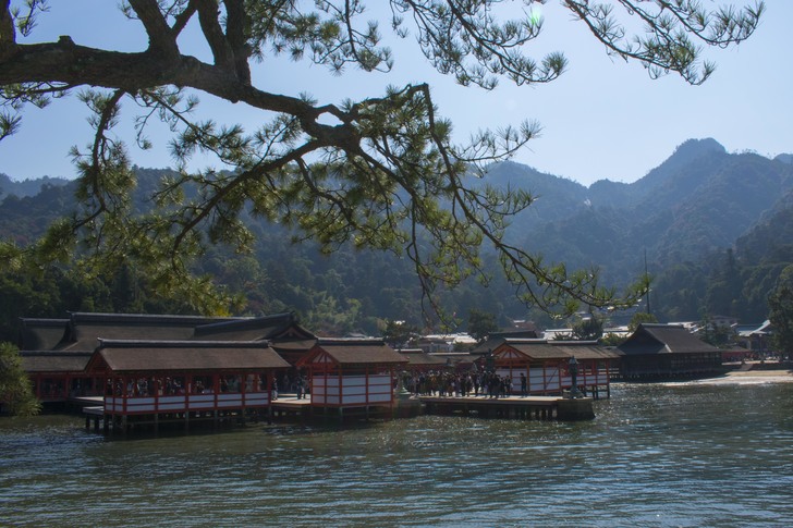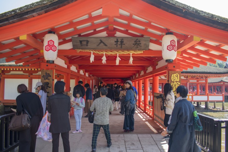 由於已經中午,所以就在宮島渡輪口附近的食堂吃了牡蠣蓋飯,還不錯。接著就是前往嚴島神社,而知名的海上鳥居在路上就能看到了。在宮島,也不能忘了紅葉鰻頭,紅葉鰻頭可說是宮島的代表特產;而宮島的飯勺的也非常有名。嚴島神社的柱子幾乎都塗上紅色,而神社則建造在沿海的岸邊,在海水的藍色跟青山的綠色的情境之中,嚴島神社更加醒目。因為還有一些時間,所以又去了附近的大聖院,大聖院是宮島最古老的寺院,據傳有1200年的歷史,寺內也有不少景點,比方說:臥佛、五百羅漢、遍照窟等等。
