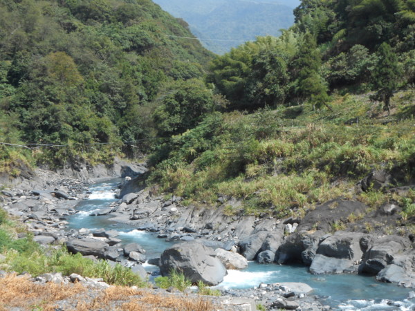 一旁澄澈的溪流非常的漂亮,但這只是開始,接下來的水泥路邊路況奇差,很多地方水泥都是直接補,沒有修平路面,導致常常有好幾公分的路面差距,甚至會撞到機車底板,而路上碾過一顆石頭,導致底板壞掉拖在地上,當時真有叫天天不應,叫地地不靈的悲愴感。但旋即想到方法,畢竟只是底板拖在地上,技術上遠比其他零件壞掉的處理簡單太多,立刻想出用繩子綁在機車放置東西的踏板上就好,不過忘了帶繩子出來,幸好附近就有茶園,當地茶農很多用完不要的繩子都直接丟在路邊,撿了兩條塑膠繩子來用,原本想說走原路回去,不要繼續走這條難走的路,不過最後還是決定繼續走。