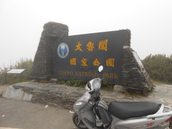 終於看到太魯閣國家公園的界碑,把機車停在界碑旁邊,來一張合照。沿途雖然因大霧看不到什麼風景,但道路左邊的山壁非常的漂亮,除了高山箭竹,還開有朵朵小花。