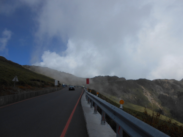 接近武嶺時,終於擺脫大霧,可以清楚的看到前方,而道路上有很多遊客直接走在馬路邊緣,但這裡車速都很慢,不會有太大危險。