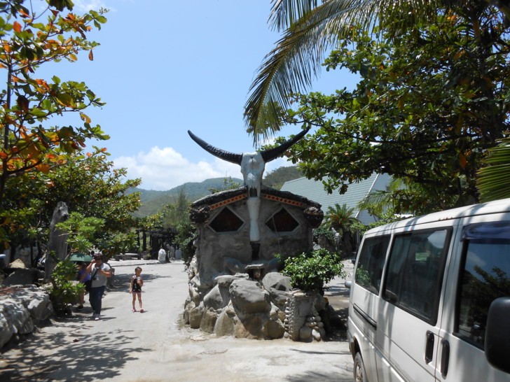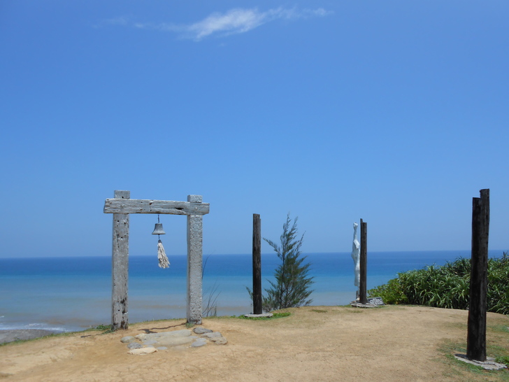在往花蓮的途中,右邊發現一個地方可以下去,寫著「牛山呼庭」,因為看到有汽車開下去,想說還有時間,也跟著一起下去,但是路非常的陡,幾乎剎車從頭按到尾,然後才終於抵達牛山呼庭。牛山呼庭算是一個休閒園區,必須買門票才能入場,不過門票可以抵消費;園區裡有一片沙灘,旁邊的山坡上擺著一些木製藝術品,算是自成一片小天地,建築裝飾也滿有特色的,後來查網路,發現這裡其實小有名氣。