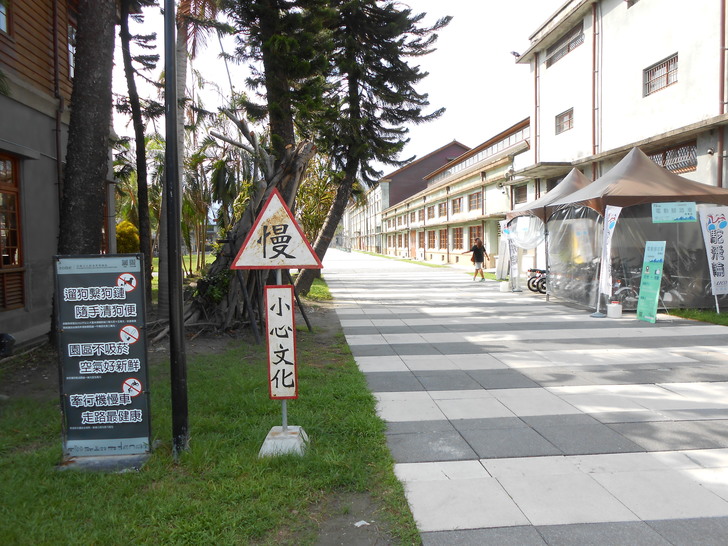之後終於抵達了花蓮市,因為網路上看到花蓮酒廠變成文創園區的消息,所以就先去酒廠,但是感覺也還好,只是賣酒跟周邊產品的地方;回到市區後,路過一個地方,叫「a-zone花蓮文化創意產業園區」,因為外觀是一整個木造建築園區,所以就下去參觀,後來才發現,其實網路說的酒廠改成文創園區的地方,是這個「a-zone花蓮文化創意產業園區」才對。建築是日治時期遺留下來的建築,室內則賣起一些文創商品,園區內也有做一些新的設計,比方說「小心文化」的警示牌之類的,如果有路過花蓮市,這裡滿值得參觀的。