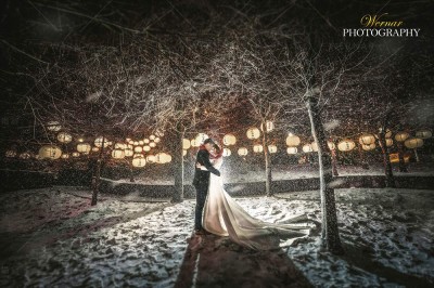 在雪景裡緊緊依靠彼此的新人,在背景吊掛許多柔和黃光的燈籠下,彷彿走入美麗古典的日式神社裡,畫面充滿無限浪漫。