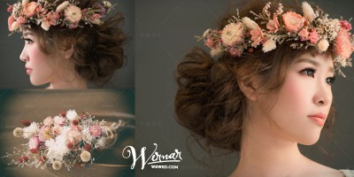 花朵是含羞待嫁新娘最絢麗的代表,乾燥花手工編織成的花冠表現新娘最自然的模樣,與淨透的臉妝搭配,呈現小女孩般稚氣可人的甜美姿態。