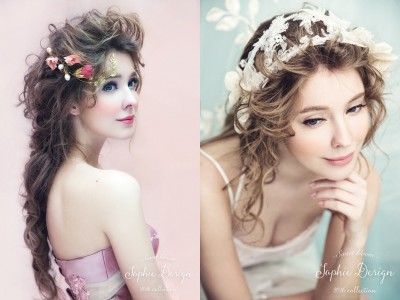白色調充滿空靈純潔的感覺,精心打造的花卉蕾絲髮帶,盤繞新娘髮間,錯落花朵蕾絲帶出自然慵懶氣息。