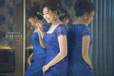 小包袖搭配寶藍色帶出媽媽的年輕氣息,大U領型剪裁,以細膩的通透蕾絲綴縫袖口邊,完美修飾媽媽在意的手臂線條。