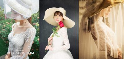 寬大的帽飾搭配花朵,呈現新娘優雅迷人的氣質,半遮面的帽飾新娘造型也別有一番風味。