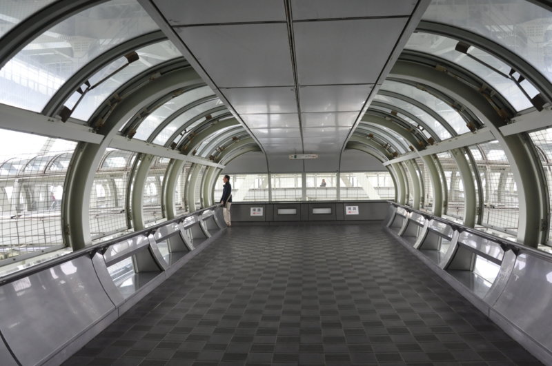 圓環狀的長廊,從左前方順路繞一圈。正前方壁上,黏貼著兩張『順路←』指示牌,只有繁體中文,是不是台灣人在此都搞不清楚遵行方向走?(日本的車子是靠左行駛)