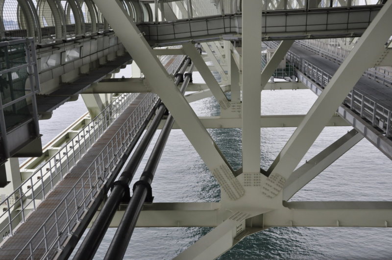出電梯後,就是海上迴遊展望台,穿過透明圓形通道,可以觀看兩邊複雜的大橋鋼樑結構。
