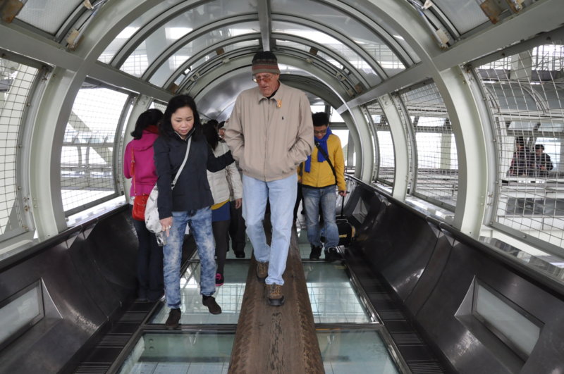 展望廣場在距陸地150公尺處的海上,地板上裝有透明玻璃地板,離海面47公尺,向下窺視,不免腳麻,膽怯且看且走。