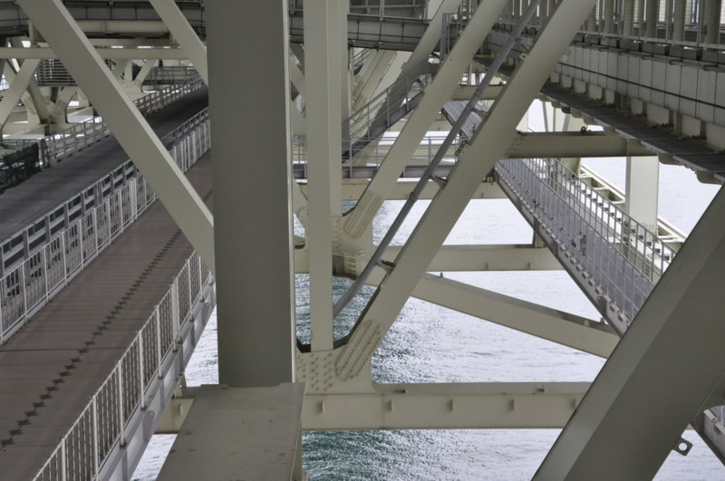 左下方步道,是維修人員的工程通道,可行四輪工程汽車;維修人員必須常常來回檢查大橋的結構及負責維修工作。