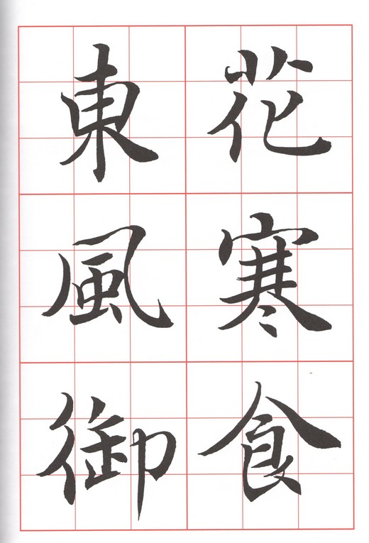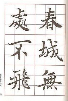 對於上學期楷書、隸書的教學書法源流書法史的概論外,對於楷書基本筆法的練習也是一個重點,尤其它們以往雖然多少有一些國小的學習經驗,但一則並沒有真正與正確的教學,再則時日已久,加上從初中到高中經過了升學為目標的升學主義教育,能有多少的基礎經驗存留,卻是很難想像的。因此從最基本的橫畫、豎畫、撇、點、捺、鉤等,到執筆、運筆法、再進而間架、布局、章法、款式的學習,真一筆一畫動、一招一式都不能馬虎!