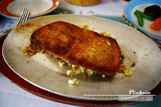 因為已經過了中午用餐時刻,但店長還是為我們推薦他們的商業午餐,雖說是商業午餐,不過還是有幾種料理可供選擇。因為不吃牛肉的我就沒機會嚐試那比較特別的零分牛排吃法,它是將生牛肉透過高溫的鐵板,依照個人喜愛的熟度去料理的一道牛排餐點。而我點了道老式蒜味豬排,這兩道比較特別之處是於鐵板之中放入了大量的蒜頭,然後加入特調醬汁拌勻,將生牛肉或是煎熟的豬肉混入其中,讓整個蒜香味融入其中,只見幾個饑腸轆轆的我們,也顧不得形象還是燙口的那份快感,最後只剩下乾乾淨淨的那只由錫和鐵合金的特制鐵盤。(因為是特別訂製的錫鐵合金鐵盤,因此少了牛排館那種經過高溫而產生的濃厚煙燻味喔)