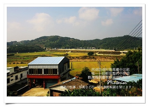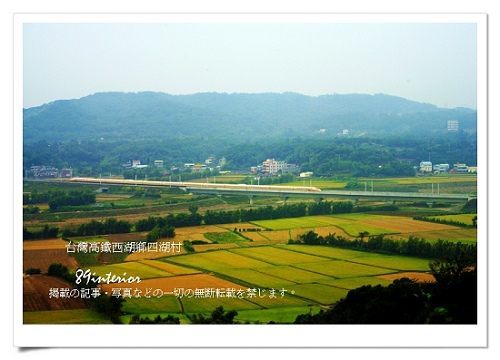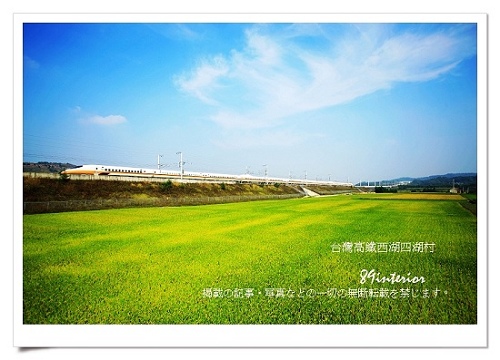 西湖鄉因為以農業為主觀光為輔,因此來到西湖四處都是具經濟效益的農作物,台灣高鐵這樣的高科技產物,劃過了這個純樸的小鎮,有點顯得些許格格不入之外,不過那白色車體與橘色相間線條,通過那一整片綠意盎然的田野,卻也勾勒出另一幅的美麗畫面。