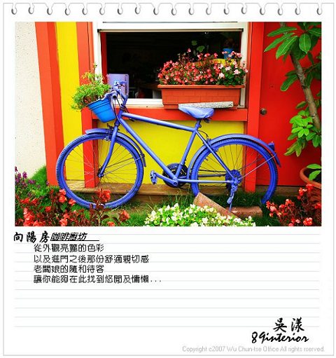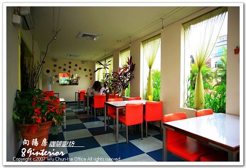 「向陽房咖啡廚坊」一家有別於一般早餐店的特色咖啡館,從外觀亮麗豐富的色彩,就讓人充滿了活力及神采奕奕的感覺,一踏入玄關的第一個印象,右邊大面玻璃窗櫺,自然採光則與窗外庭園花草相互揮映,室內白色牆面與藍白格子地板,讓紅色的的休閒坐椅更顯得出色及鮮明。