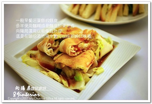老闆娘蘇小姐向我介紹的總匯三明治,裡頭的配料完全是自己手工制作,JW點了一份蔬菜蛋餅,她則極力向我推荐要我也來一份嚐嚐口味,因此老闆娘又幫我製作了一份培根蛋餅,這是我吃過比較特別的蛋餅,一般蛋餅餅皮通常是麵糊或是麵皮製成,但向陽房使用的是以粄條為餅皮,因此口感及咬勁是比較特別,另外值得一提的是「向陽房」的印度奶茶,香濃可口讓你喝了還想再續杯捏。