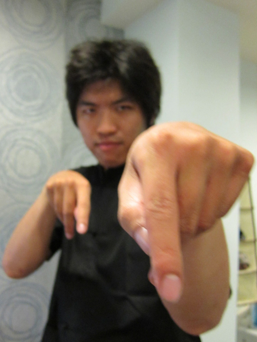 六、對方反制:老師常說,練功夫就像打電動,回合制度哪可能只有你一個人走好多指令,對方只能傻傻站著?他看到我的動作也一定會反制呢!這次的狀況是他用另外一支手來阻擋我的攻擊,怎麼辦呢?↓