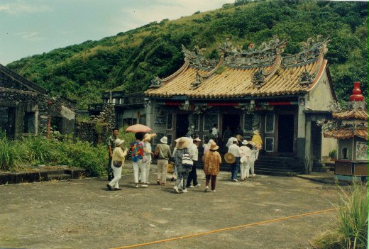 媽祖神像隨居民遷到大溪的仁澤新村後,島上的拱蘭宮有好幾年時間成了一座沒有神像的廟。七十八年春天,我在島上聽駐軍講故事,說在某一年的大颱風夜,有兩名戰士在龜尾營房站崗時,突然望見遠處的拱蘭宮屋頂,亮著一片紅光,以為發生火警,前去查看結果卻一切如常。後來又陸續有其他戰士見此「異象」,便有人從台灣本島捧去一尊觀音菩薩瓷像,駐廟「坐鎮」,旁邊另外立了一個「中華民族列祖列宗」的牌位,做為部分戰士宗教信仰的場所。