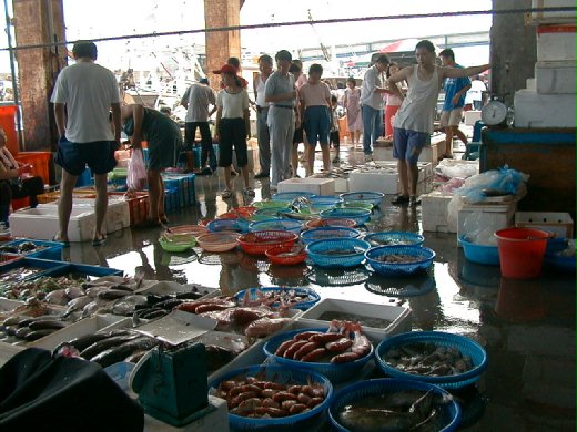 那些魚,從桶裡倒出來時,有的還會在濕淋淋的地板上,打得霹哩啪啦響,那是牠們向生命告別的輓歌,橫豎很快就歸於寂靜,任憑擺佈宰割。取而代之的,便是論斤計兩的沸騰人聲。