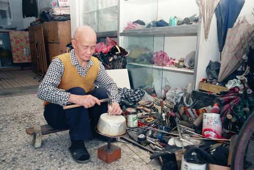 只是他仍不停地敲敲打打守著攤子,直到身體支撐不住,才放下他的工具。二00五年,九十六歲的王老師傅閉上眼睛,上天休息當神仙去了。