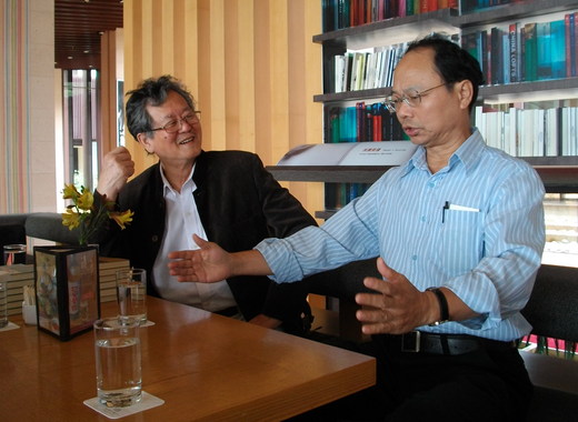 黃春明(左)講故事一把罩,聽別人說故事時也聽得比任何人都專注。 魏得璇/攝