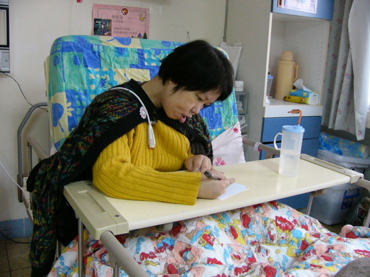 宜蘭醫院護理之家病床上,近八年來一直住著一名幾乎渾身動彈不得的女人。她憑著意志力,勾著頭用不太聽從使喚的手指,捏著原子筆,在稿紙上一個字一個字的寫下心裡的感觸。然後,再利用筆記型電腦的軌跡球,把所寫的文章,逐字逐句地鍵在電腦上。