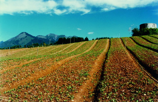 大片的玉蜀黍田在山坡上展開,棵棵挺直腰幹的站在礫石和雜草間開花結穗。農作中的婦女,不論老少都喜愛穿著紅艷的服飾。這在綠色的群山中,相當奪目。