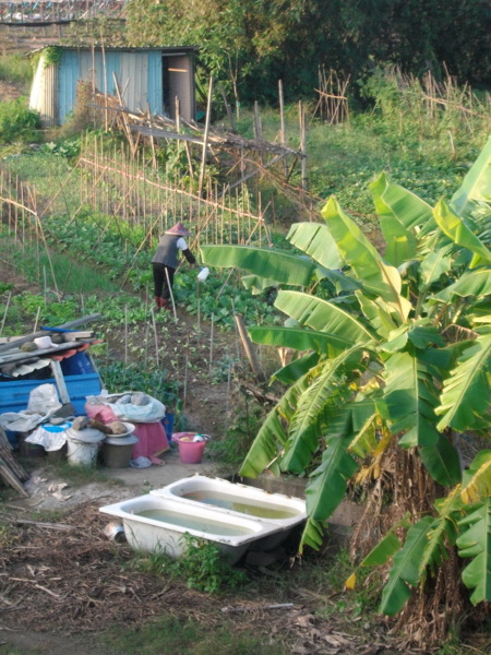 他似乎認定這真的是個露天澡堂,我不好再誑他,便將浴缸會被安置在菜園的緣由和用途加以說明。告訴這位旅居國外多年的朋友說,農人不管在哪塊地上種青菜水果,除非老天能經常下點雨,都少不得要覓水源澆灌園圃。
