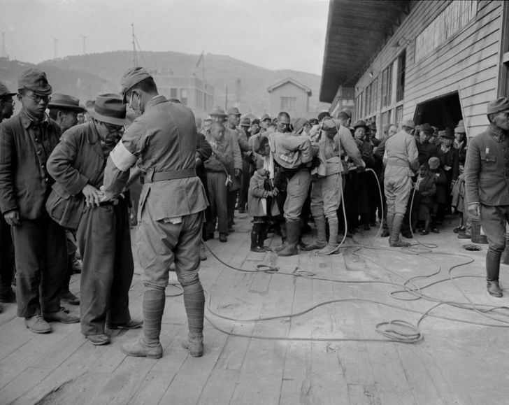 朝鮮大學生在日本士兵看管下去上班(照片拍攝於1910年至1945年日本殖民統治下的朝鮮)。