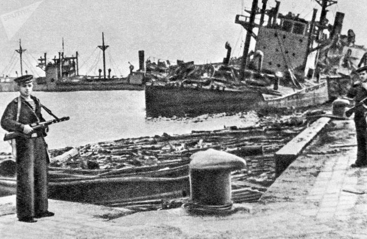 被蘇聯空軍摧毀的日本艦艇停泊在羅津港。
