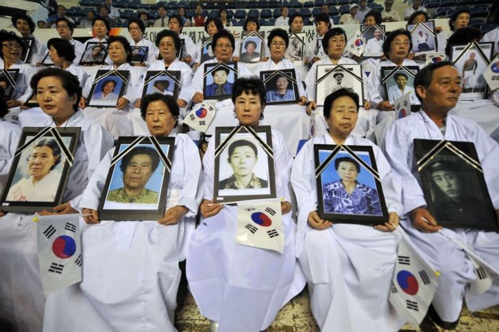 朝鮮人手捧在紀念從日本殖民統治下解放66週年的反日遊行中死去的家庭成員肖像。