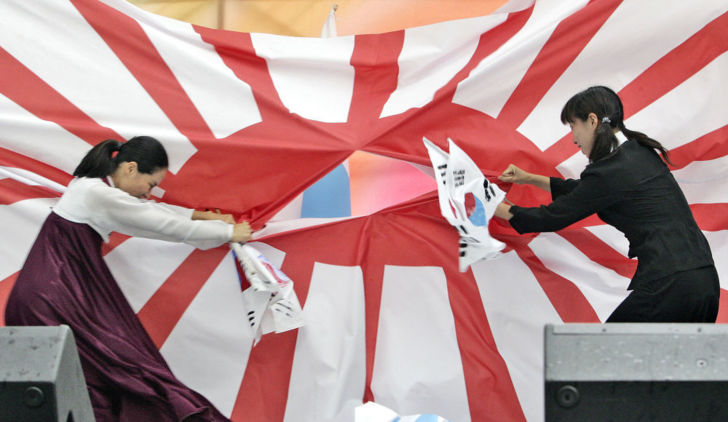 韓國大學生們在韓國半島從日本殖民統治下解放週年紀念日的紀念遊行中撕毀日本殖民統治時的日本國旗。