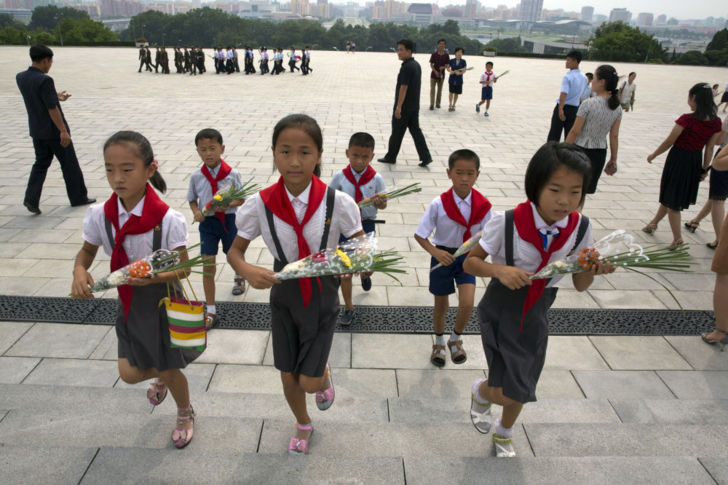 第二次世界大戰結束日和從日本殖民統治下解放週年紀念日,朝鮮中小學生們向平壤金日成和金正日紀念碑獻花。