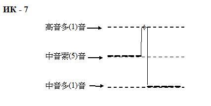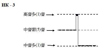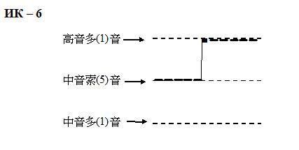 節=調心」前的音節,用「起音」的「索」來讀,到了「重讀音節=調心」時,該「重讀音節=調心」用高音「多」讀出,後面的各音節立刻降至中音的「多」讀至結束。如:погóда 天氣。