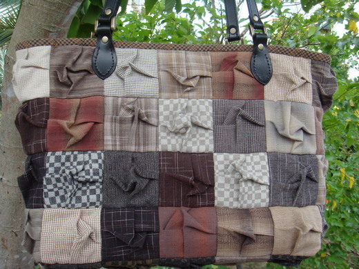 一顆顆尚未填充的泡芙,組成一個實用的袋子,先染布的魅力,完全顯現出來.先染布雖然色澤沒有印花布的亮麗,但樸實的風貌,卻是受到拼布朋友們的喜愛.