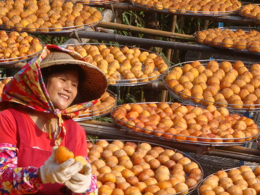 看到了一顆顆黃澄澄的柿子,沐浴在陽光之中,接受陽光的洗禮,再加上工作人員的手工按摩和炭火烘培,就成了另人垂涎三尺的柿餅.