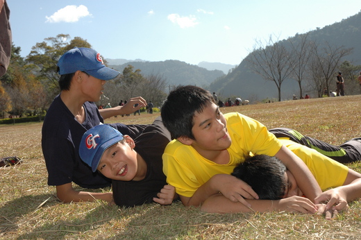 在溫暖的冬陽中,躺在草地上野人獻曝,很舒服呢!大家一起曬,更過癮!!沒有地方好逛,只好在草坪上打棒球,疊羅漢,丟飛盤.大人們就聊聊"媽媽經".