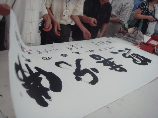 藉由此次的交流的自由活動參觀,有柳暗花明目不暇給之感的福州,予人有著濃郁的人文氣息,其作為為福建省省會,實當之無愧,這是和已往隨團行動來去匆匆有著天壤之別。下午2點半小柯原本說要帶我們到于山附近景點走走,可是車子卻停在定光寺福州畫院藝術館前,既然來了抱著疑惑下車,看見已有人在展場提筆揮毫,有人說是要與金門參展者筆會交流,因為沒有筆與印章都在飯店沒有帶來,只好再搭原來的車子返回飯店拿,還好往返路程不遠,手持筆、印到達即行開始了閩臺兩地書法揮毫、切磋與觀摩,各各磨拳擦掌,躍躍欲試,每人都拿出看家本領,福州與臺灣代表的我們輪流書寫,或行或隸或篆,人人全神貫注,每寫好一幅作品都會有人予以掌聲,亦有一幅作品由閩臺兩地各書寫一半,例如「兩岸情深」由閩方寫“