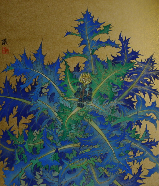 原來美不總是來自於舒心甜蜜的感受,有時候它偏偏來自於一次疼痛經歷引起的昇華。到如今我依然不知道它的芳名。我知道它的花蕾開在帶荊刺的綠葉叢中;我知道它開嫩黃色的花兒;我還知道它的種子像白色的絨花一樣,而每一顆種子會在秋風裡帶著各自的絨毛像那漫天飛舞的“飛天玄女”一樣飄落四方。哦!現在這畫裡的一切已經與它的芳名無關,即使知道了又怎樣呢?美!只有美才是它最好的注釋。