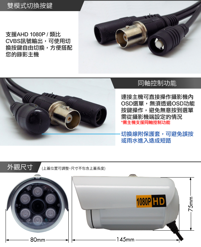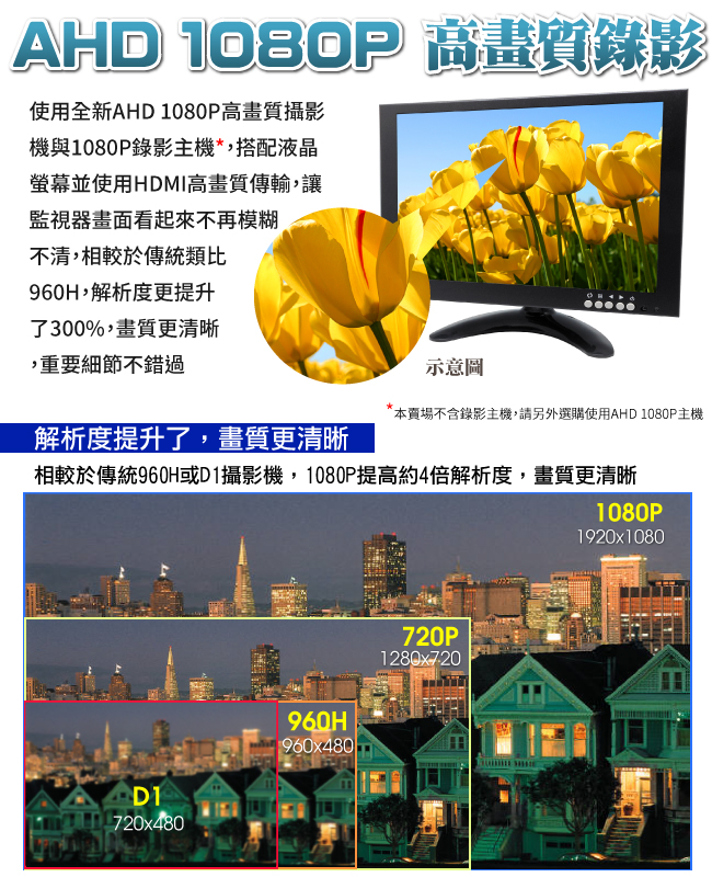本商品建議搭配最新高畫質AHD 1080P數位監控主機,並可切換為類比訊號2000TVL支援傳統960H或D1監控主機使用,AHD 1080P數位監控主機可將1080P 200萬畫素攝影鏡頭,個別調整解析度為1080P錄影規格,而1920X1080畫質更佳且可真實呈現,而監視主機建議輸出顯示畫面可選擇HDMI傳輸,影像將呈現1080P高解析1920*1080顯示,有別於過去960H(960*480) 及D1 (720*480)畫質辨識度不足之缺點,這非過去監控畫面畫質所能比擬。?