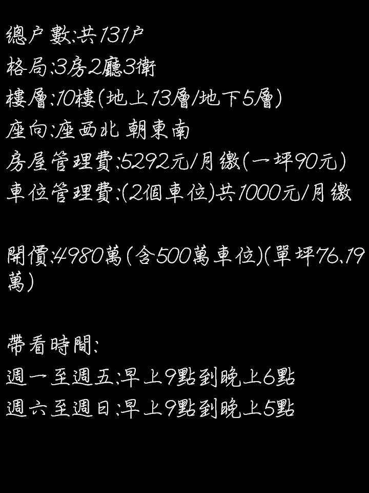 開價:4980萬(含500萬車位)(單坪76.19萬)