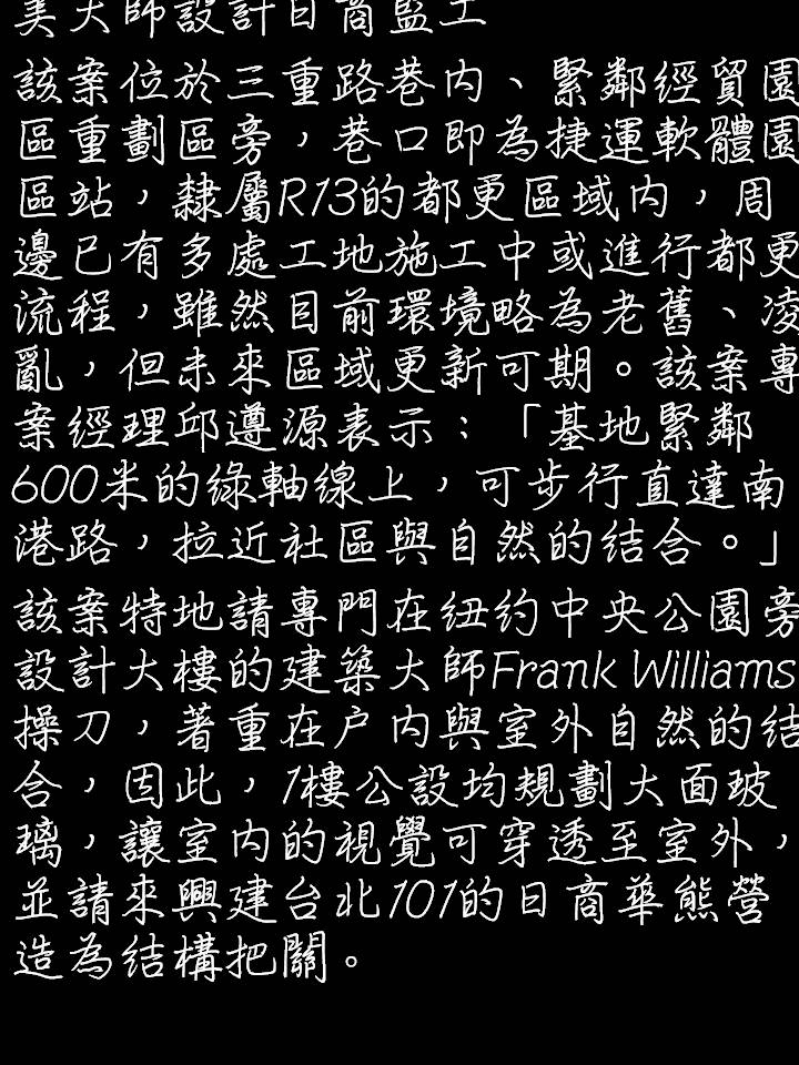 該案特地請專門在紐約中央公園旁設計大樓的建築大師Frank Williams操刀,著重在戶內與室外自然的結合,因此,1樓公設均規劃大面玻璃,讓室內的視覺可穿透至室外,並請來興建台北101的日商華熊營造為結構把關。