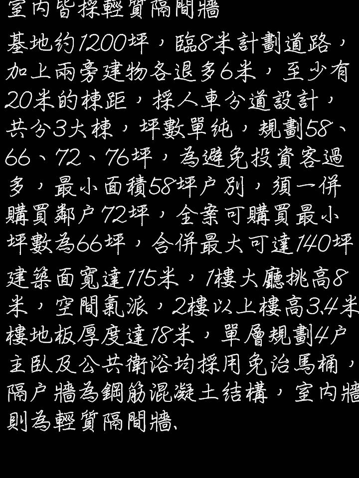 基地約1200坪,臨8米計劃道路,加上兩旁建物各退多6米,至少有20米的棟距,採人車分道設計,共分3大棟,坪數單純,規劃58、66、72、76坪,為避免投資客過多,最小面積58坪戶別,須一併購買鄰戶72坪,全案可購買最小坪數為66坪,合併最大可達140坪。