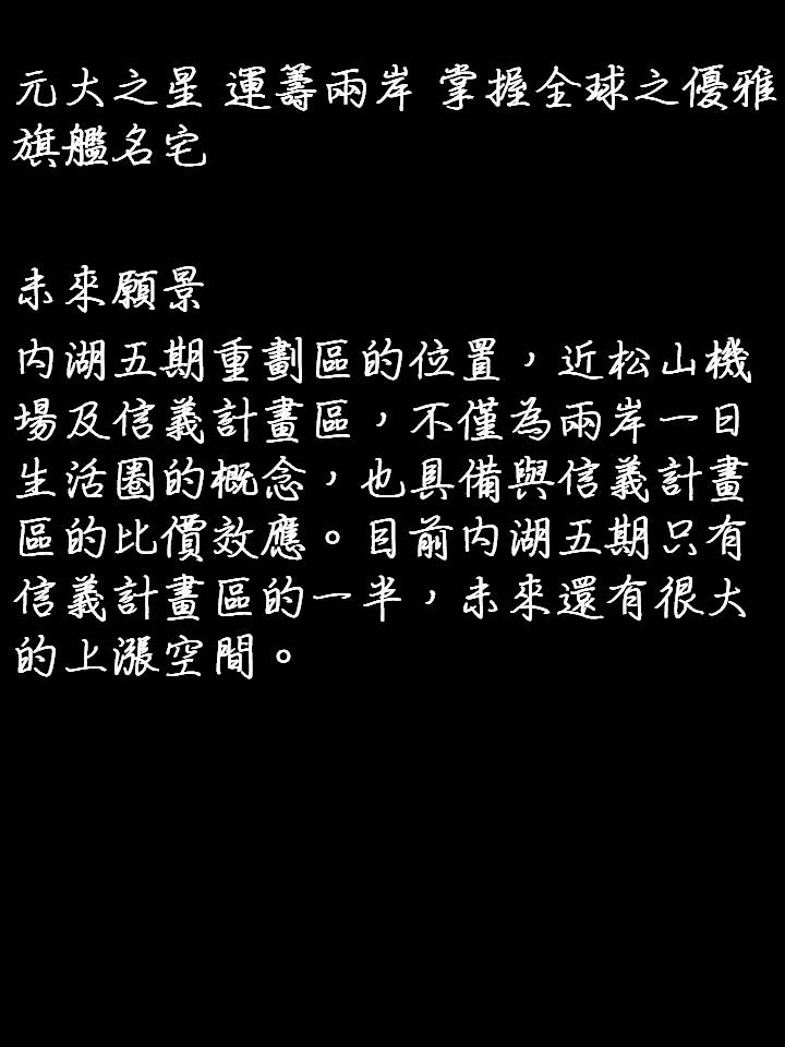 內湖五期重劃區的位置,近松山機場及信義計畫區,不僅為兩岸一日生活圈的概念,也具備與信義計畫區的比價效應。目前內湖五期只有信義計畫區的一半,未來還有很大的上漲空間。