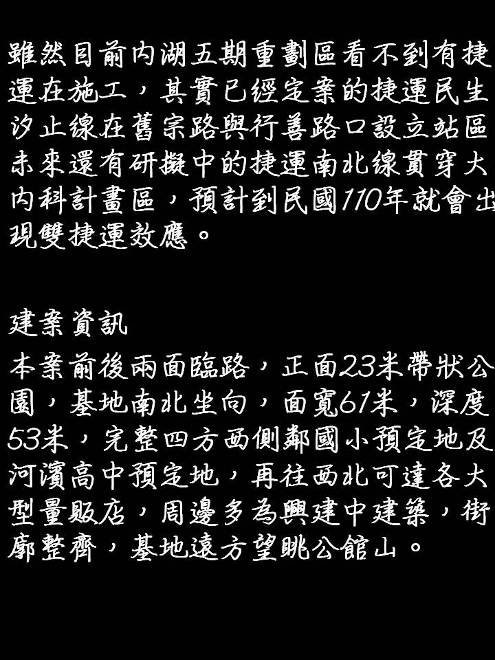 雖然目前內湖五期重劃區看不到有捷運在施工,其實已經定案的捷運民生汐止線在舊宗路與行善路口設立站區,未來還有研擬中的捷運南北線貫穿大內科計畫區,預計到民國110年就會出現雙捷運效應。
