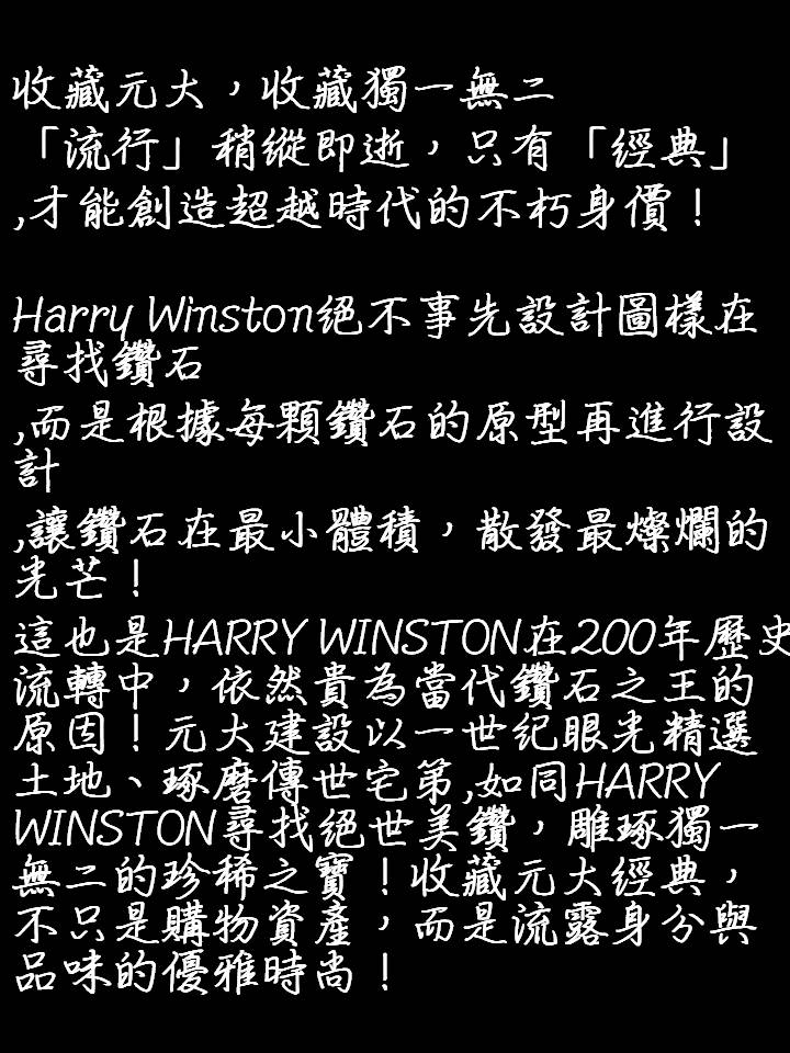 這也是HARRY WINSTON在200年歷史流轉中,依然貴為當代鑽石之王的原因!元大建設以一世紀眼光精選土地、琢磨傳世宅第,如同HARRY WINSTON尋找絕世美鑽,雕琢獨一無二的珍稀之寶!收藏元大經典,不只是購物資產,而是流露身分與品味的優雅時尚!