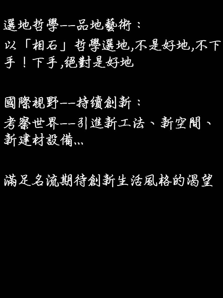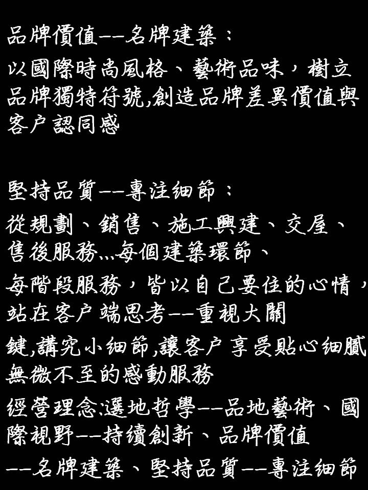 經營理念:選地哲學--品地藝術、國際視野--持續創新、品牌價值